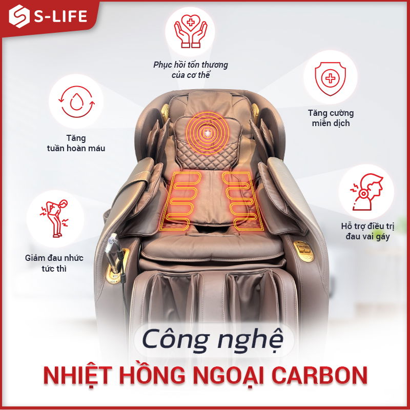 Nhiều ghế massage của S-life , chẳng hạn như S-lux President X1 cao cấp, cho đến S-lux SM15 cấp thấp hơn, có hệ thống sưởi ấm áp dần dần làm ấm gối hơi ở vùng thắt lưng để kết hợp nhiệt vào vùng lưng dưới của bạn và tăng cường kết quả là giảm đau lưng của bạn. Trong khi đó, sử dụng sợi carbon làm nguồn sưởi bằng tia hồng ngoại. Nó không chỉ lý tưởng để điều trị đau thắt lưng mà còn đặc biệt thư giãn trong mùa đông.