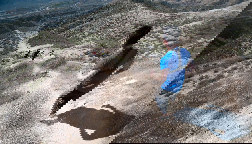 Đứng bằng chân phải ngay trước chân kia và hai tay chống hông. Giữ chân phải thẳng và ngón chân hướng lên, uốn cong chân trái.